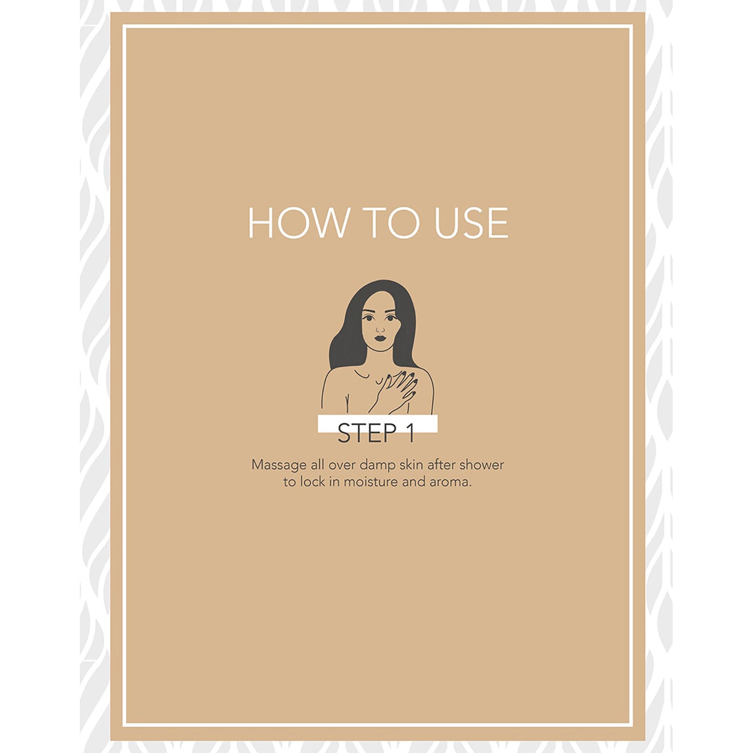 Massage all over the damp skin right after the shower to lock in precious moisture and envelop you with a distinctive aroma.