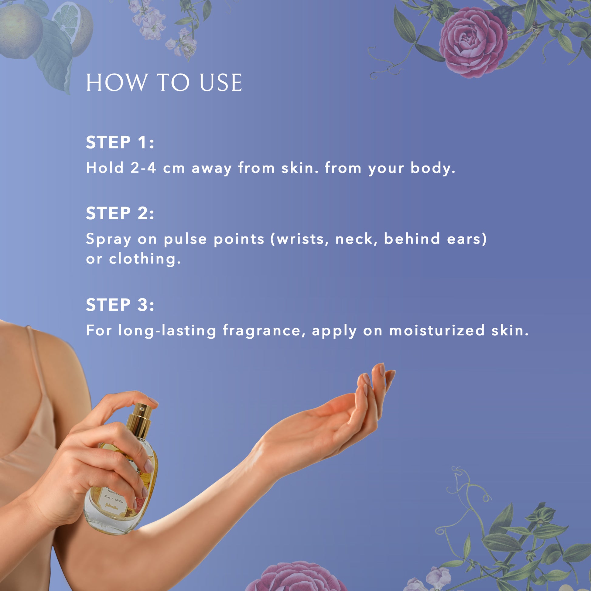 Hold 10 cm away, spray on pulse points or clothing. For lasting scent, apply on moisturized skin.