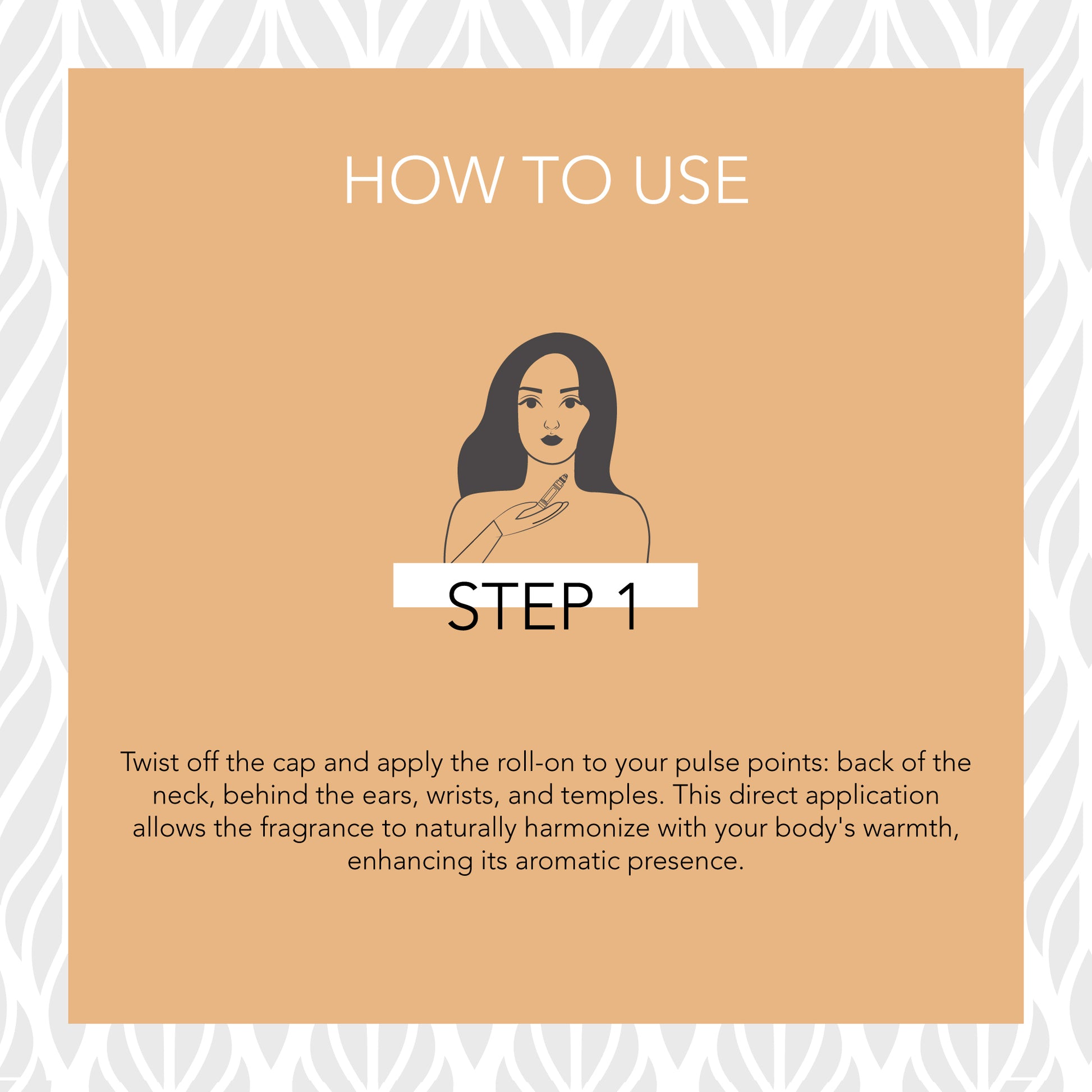 Twist off the cap and apply the roll-on to your pulse points: back of the neck, behind the ears, wrists, and temples. This direct application allows the fragrance to naturally harmonize with your body's warmth, enhancing its aromatic presence.
