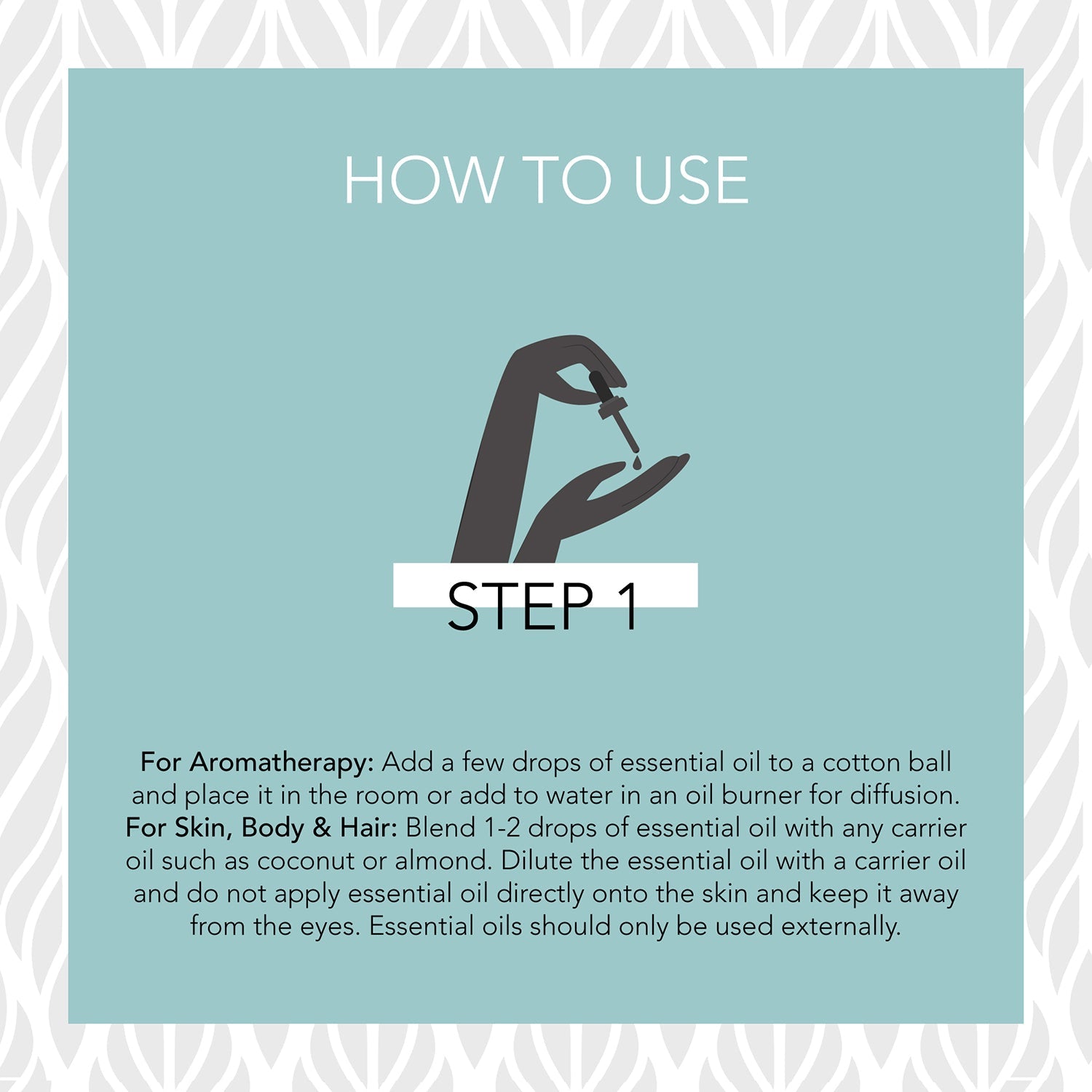 ROSEMARY ESSENTIAL OIL FOR AROMATHERAPYAdd a few drops of essential oil to your diffuser to disperse the aroma in the air.ROSEMARY ESSENTIAL OIL FOR BATHSTEP 1:Mix 4 to 6 drops of essential oil with your favourite JC carrier oil.STEP 2:Add the oil mix to the water and stir it. Step in and relax for 20-30 minutes.ROSEMARY ESSENTIAL OIL FOR RELAXING MASSAGE STEP 1: Warm your favourite JC carrier oil and add a few drops of the essential oil to it. STEP 2: Mix well and massage all over your skin and hair for a relaxing experience. ROSEMARY ESSENTIAL OIL AS BODY OIL STEP 1: Add a few drops of essential oil to your favourite JC body oil and mix well. STEP 2: Massage the oil mix onto damp skin post-bath.