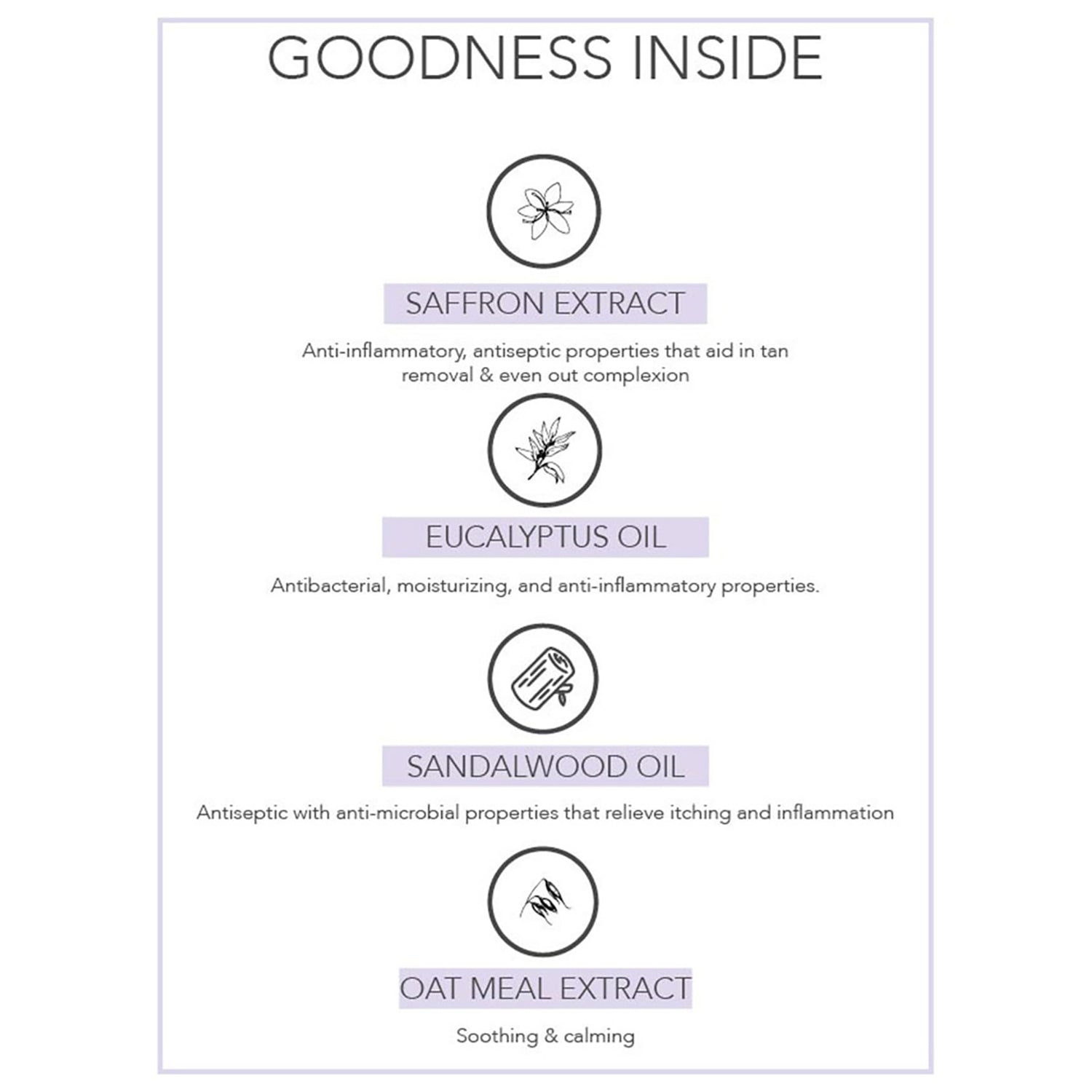 Avena Sativa Oat Meal Extract, Butyrospermum Parkii (Shea) Butter , Citrus Aurantium (Orange) Fruit Oil, Crocus Sativus (Saffron) Flower Extract, Disodium EDTA, Eucalyptus Citriodora (Eucalyptus) Oil, Santalum Album (Sandalwood) Extract, Theobroma Cacao (Cocoa) Seed Butter, Tocopheryl Acetate (Vitamin E),